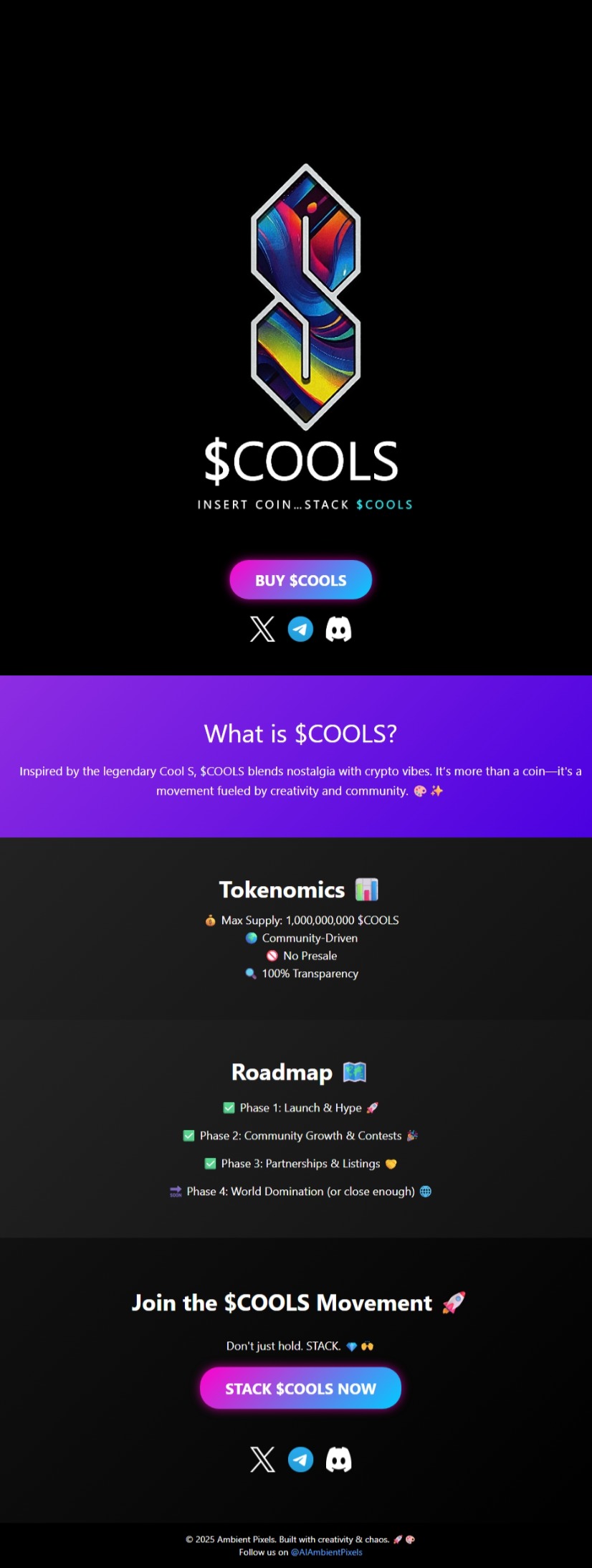 $COOLS is a community-driven cryptocurrency project that brings the iconic Cool S symbol from 90s school culture to the blockchain. This project combines nostalgia with modern web3 technology to create a fun and engaging community experience.